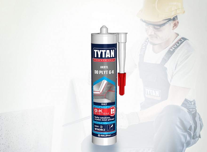 W systemie Tytan zaleca się spoinowanie płyt g-k akrylem. Ten preparat powinien być nakładany tylko w miejscach łączenia płyt mocowanych do różnych powierzchni. Aplikację można prowadzić w narożach łączących dwie ściany albo ścianę z sufitem. Profesjonalny akryl Tytan do płyt g-k nakłada się także w szczeliny pomiędzy płytą a podłożem lub ścianą. Można aplikować ją na dowolne podłoża, także wilgotne. Po aplikacji i związaniu powierzchnię akrylu można bez obaw pokryć farbą. Wysoka elastyczność gotowej masy akrylowej do płyt gipsowych utrzymuje się przez wiele lat.