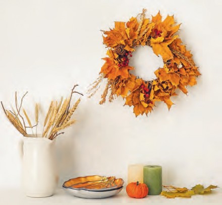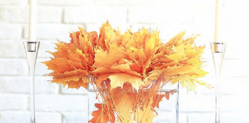 Opadające o tej porze roku liście o wyrazistych, ognistych, ciepłych, energetycznych kolorach kuszą swoją dekoracyjnością. Trudno czasem powstrzymać się od ich zbierania i komponowania bukietów. Szczególnie naszą sympatię budzą okazałe i piękne, bo przebarwiające się w różnych gamach koloru żółtego i czerwonego liście klonu o charakterystycznym kształcie. Korzystajmy, wprowadźmy nieco złotej jesieni do naszych wnętrz i użyjmy ich jako barwnej dekoracji. Bukiety z liści możemy umieszczać w ozdobnych szklanych i ceramicznych wazonach, ale także układać luźno w oryginalnych misach i paterach. Bardzo atrakcyjnie wyglądają jesienne liście wplecione w wianki. Możemy wkomponować tam ich różne odmiany, a także wzbogacić plecionkę o owoce, trawy i inne dary jesieni. Zawieszone na ścianach, w oknach czy na skrzydłach drzwi niebagatelnie wyróżnią tę przestrzeń. Jesienne liście będą wdzięczną dekoracją wkomponowane w ikebany. Zaopatrzmy się na ten cel w gąbkę florystyczną i spróbujmy samodzielnie stworzyć wielobarwne kompozycje w formie stroików „uświetniające” nasze stoły oraz ławy.